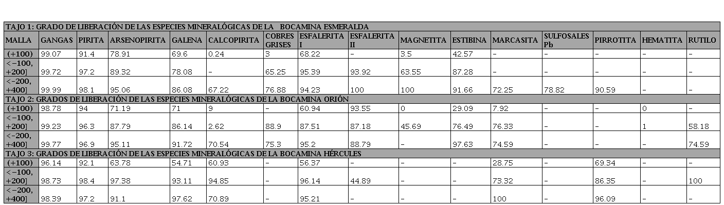El análisis de los grados de liberación de minerales en la bocamina Esmeralda para determinar el grado de liberación de galena y sulfosales de plomo reportó valores de 86.08% y 78.82%, respectivamente, determinados para un tamaño de partícula de 100% −200 malla. Se observó un grado de liberación del 95.06% para los contaminantes de arsenopirita, 76.88% para los cobres grises, 100% para la esfalerita tipo II y 91.66% para la estibina. Estos valores se determinaron a tamaños de partículas inferiores a la malla 200. De la misma manera, se reportó que el mayor grado de liberación en esfalerita tipo I fue identificado para un tamaño de partícula de 100 % −100 malla.