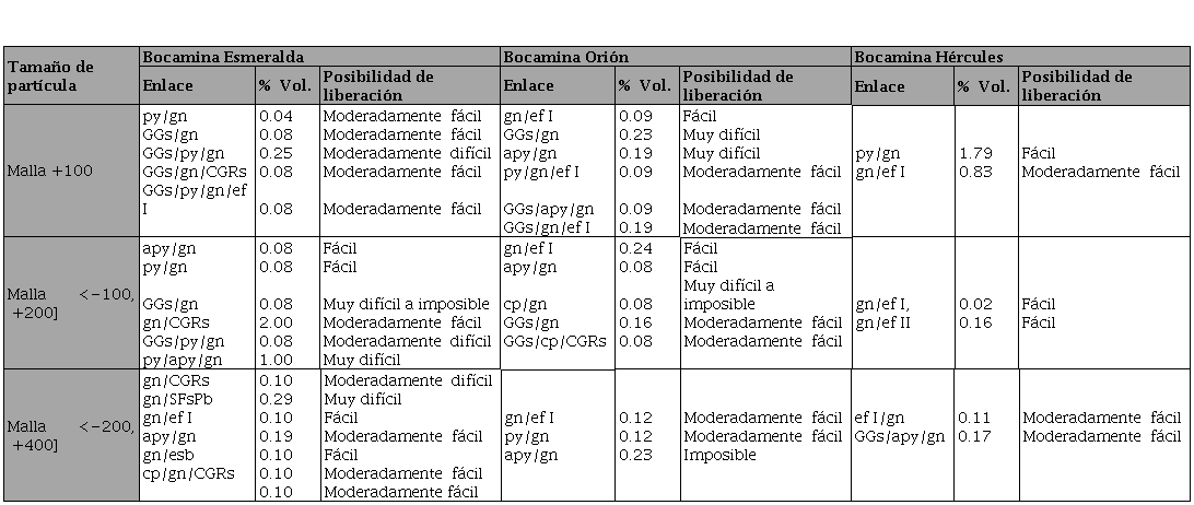 En una muestra representativa de la bocamina Orión, a una granulometría de 100% +100 malla, se observó que la galena formó enlaces con la arsenopirita, los cuales se identificaron como muy difíciles de liberar. Considerando un tamaño de partícula de 100% −100 malla, los enlaces formados entre galena y la calcopirita se identificaron como muy difíciles de liberar. Por último, para una granulometría de 100% −200 malla, el enlace formado por la galena y la arsenopirita se identificó como imposible de liberar.