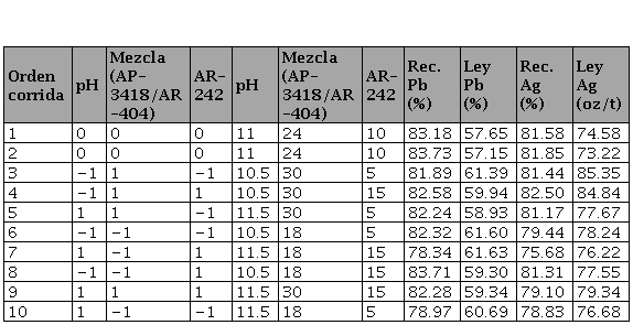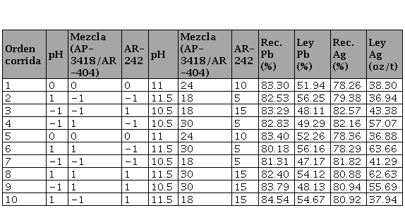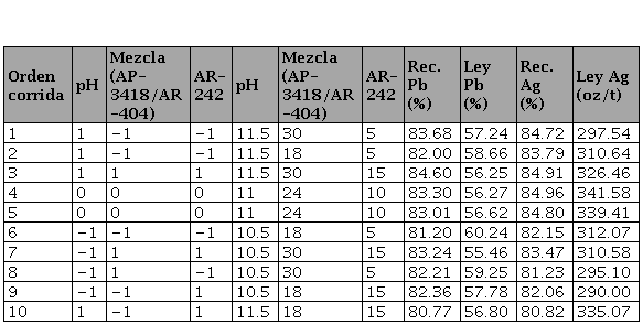 Se estableció un plan de pruebas de acuerdo con la plantilla de Plackett-Burman determinadas por el software a fin de evaluar el efecto de las variables mezcla de reactivos (AP-3418/AR-404, AR-242) y el pH de la pulpa sobre la recuperación y calidad del concentrado de plomo y plata. Las otras variables del proceso se mantuvieron constantes durante el desarrollo de las pruebas metalúrgicas de flotación a nivel de laboratorio.