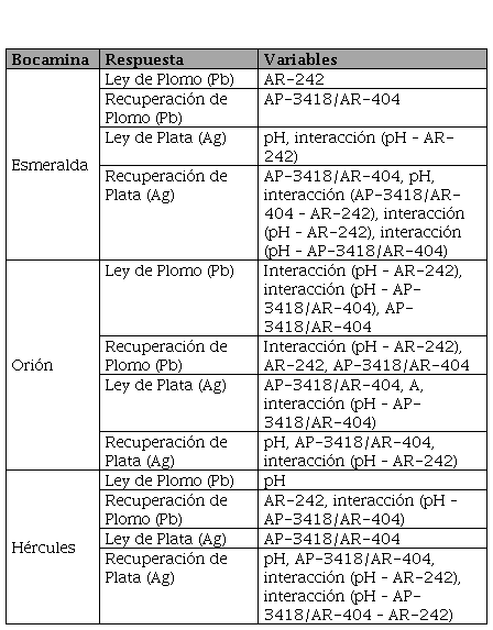 La Tabla 8 resume la influencia de las variables pH, mezcla (AP-3418/AR-404), AR-242 y sus interacciones sobre las variables respuestas de recuperación y calidad del concentrado para las distintas bocaminas.