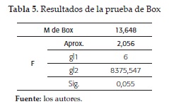 El análisis de supuesto de igualdad de matrices de varianza-covarianza para los dos grupos se comprobó con la prueba de Box, como se muestra en la tabla 5.
