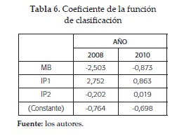 Al analizar las funciones discriminantes generadas en la tabla 6 se puede concluir que existen diferencias entre los indicadores de las empresas prestadoras de salud del Régimen Contributivo de salud en Colombia en 2008 y 2010. Los indicadores MB e IP1 presentan deterioro, y el indicador IP2 muestra un mejoramiento en el periodo estudiado. Lo anterior es coherente con los resultados obtenidos por Zapata et al. (22), quienes encontraron que la rentabilidad para el accionista y operativa para las EPS está muy por debajo en comparación con entidades de la salud, específicamente en lo relacionado con los niveles de productividad.