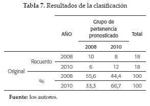 Con relación a los resultados del modelo, la capacidad de clasificación es buena; se obtuvo un error tipo I de 44,4 % y un error tipo II de 33.3 %, para un promedio de clasificación de 61,1 % de los casos agrupados correctamente, como se muestra en la tabla 7.