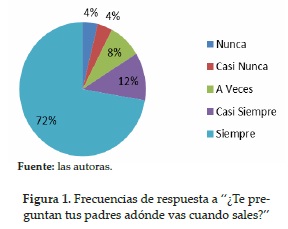 Al respecto y tal como se evidencia en la tabulación de la primera pregunta de la escala Lickert: "¿Te preguntan tus padres adónde vas cuando sales?" (figura 1), relacionada con el conocimiento que tienen los padres acerca de la vida cotidiana de sus hijos, se puedo evidenciar que para un 72 % sus padres "Siempre" preguntan a sus hijos por el lugar donde se encuentran cuando salen del hogar; el 12 % marcó la opción "Casi siempre"; el porcentaje restante, equivalente al 16 % del total de la muestra ubicó sus respuestas entre las categorías "A veces", "Casi nunca" y la opción "Nunca".