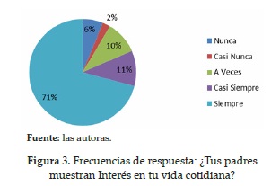 La figura 3 presenta el interés que tienen los padres de familia por la vida cotidiana de sus hijos, que en un 72 % manifestaron que sienten "Siempre" dicho interés, versus un 18 % que vacila entre las opciones "A veces", "Casi nunca" y "Nunca".