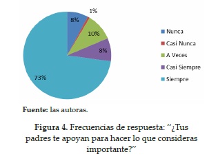 Resultados similares se encontraron en las preguntas "¿Tus padres te apoyan para hacer los que consideras importante?", que obtuvo un 73 % en la opción "Siempre", "Casi siempre" un 8 % y las opciones "A veces", "Casi nunca" y "Nunca" un 19 %, obtenido de la sumatoria de los porcentajes individuales (figura 7).