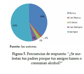 El 16 % es un porcentaje significativo, teniendo en cuenta la cantidad de personas incluidas en la encuesta (130), y evidencia la presencia de varios hogares en los que el involucramiento familiar con la vida de los hijos no se ve reflejado en la cotidianidad. Por el contrario, el 84 % de los jóvenes encuestados expresó que siente el interés de sus padres respecto a sus actividades cotidianas, lo cual se constituye en un factor protector importante, que como veremos, se refleja en los datos de consumo de los estudiantes encuestados.