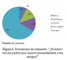 En la figura 6 se exponen las respuestas a la pregunta "¿Se interesan tus padres por conocer personalmente a tus amigos?"; respecto a la cual el 67 % afirmó que "Siempre", el 14 % "Casi siempre" y el 19 % que agrupa las respuestas "A veces", "Casi nunca" y "Nunca".