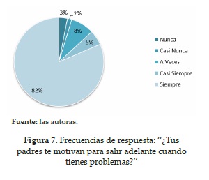 La figura 7 presenta las respuestas referentes a la motivación que expresan los padres ante los problemas de sus hijos; pregunta respecto a la cual un 82 % afirmó que "Siempre", siente dicho apoyo emocional, seguido del 5 % a la opción "Casi siempre" y un 13 % que agrupa las opciones de respuestas "A veces", "Casi nunca" y "Nunca".