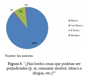 Sin embargo, para reconocer que esta magnitud de apoyo e involucramiento familiar, encontrado en un segmento de la población (73 % - 82 %), tiene relación con la manera como los jóvenes se resuelven ante situaciones de riesgo, es necesario observar la relación de dichos datos con la pregunta de referencia que hemos seleccionado como guía en este estudio (Pregunta 6 en la escala Lickert): "¿Has hecho cosas que podrían ser perjudiciales (p. ej.: consumir alcohol, tabaco o drogas, viajar con amigos a altas velocidades, participar en peleas, haber tenido prácticas sexuales de riesgo, dejar de alimentarte por tiempo prolongado, provocarte vómito intencionalmente, etc.)?"