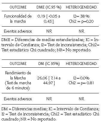 Es importante destacar que respecto a los datos obtenidos para el outcome funcionalidad de la marcha, diversos estudios utilizaron distintas escalas, por lo cual el metaanálisis se realizó con base en diferencias de medias estandarizadas (DME) y el 95 % de intervalos de confianza (IC).