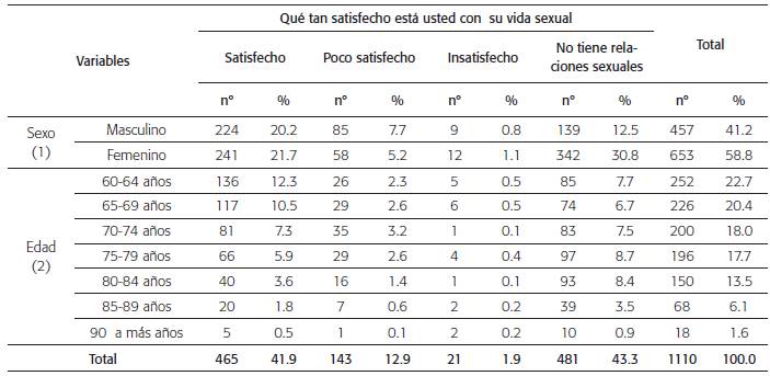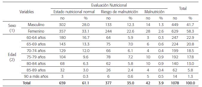 Materials and methods: Quantitative, descriptive, exploratory, cross-sectional study. Valuation scales were used: Minimental State Examination (MMSE), The Mini Nutritional Assessment (MNA-SF) (GOHAI), Functional Assessment Stages (Fast), Yesavage and Sheikh Depression Scale, Morisky Green Test, Katz Index, and Lawton Scale for activities of daily living. It was applied in the 12 provinces of the region La Libertad. Sample of 1110.