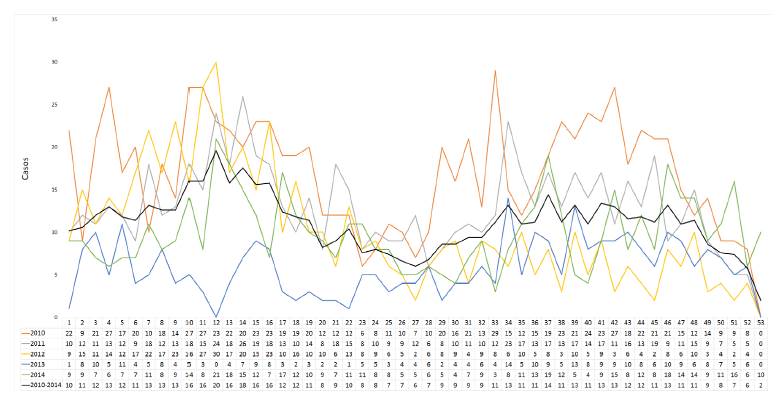 Estudio descriptivo transversal, retrospectivo. La información se consolidó con base en los registros de la notificación obligatoria del evento al Sivigila de la Secretaría de Salud de Casanare (SSC) durante el período 2010-2014.