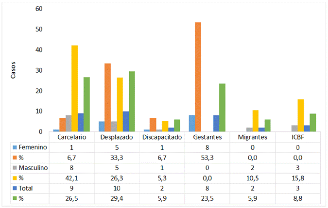 Una mínima proporción se identificó como pertenecientes a una etnia; entre ellos, la mayor proporción se identificó como afrocolombiano, seguido por indígena. Así mismo, una mínima proporción se identificó como perteneciente a un grupo poblacional; entre los cuales, la mayor proporción se encontró en desplazados, seguido por el carcelario y las gestantes.