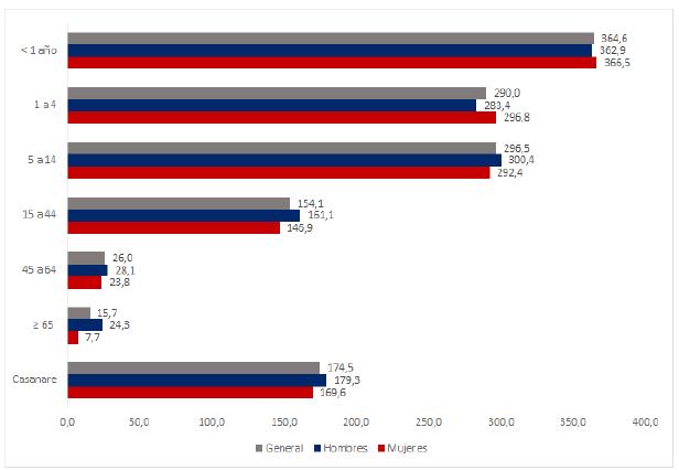 Al analizar la tasa de incidencia por grupo etario, los más afectados son los menores de 5 años de edad , seguidos por los menores entre los 5 y 14 años de edad; tasas inferiores a las reportadas por el país en niños menores de cinco años de 702/100 000 entre 2010-2012 y 672/100 000 entre 2013 y 2014 24. Adicionalmete, según el área de procedencia, la mayor tasa de incidencia se presentó en el área urbana, donde los municipios de Sácama, Monterrey, Tauramena, Orocué, Hato Corozal, Aguazul, Maní y Yopal, en su orden, presentaron una tasa inferior a la del departamento; mientras que en el área rural las tasas más altas fueron para los municipios de Chámeza, La Salina, Sácama, Pore, Recetor, Tauramena, Villanueva y Monterrey, este último con una tasa ocho veces superior a la departamental.