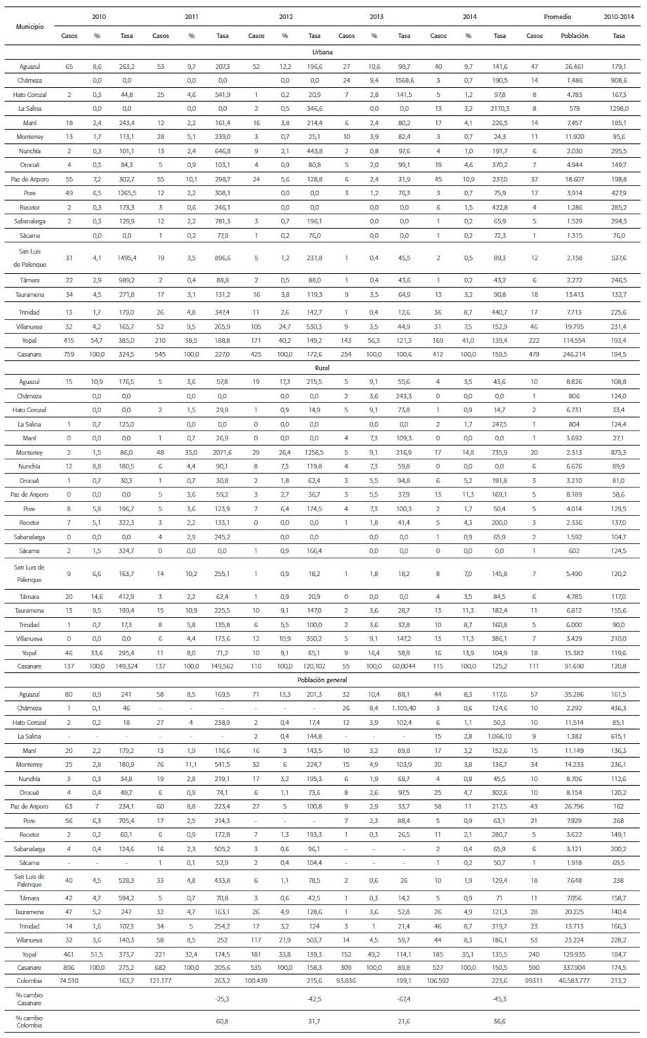 La tasa de incidencia fue inferior a la del país, es decir, en Casanare se presentaron en promedio 38 casos menos por cada 100 000 habitantes durante el período, equivalente a una reducción de la incidencia en promedio de 45,1 %; mientras que para el país se evidencia un incremento en promedio de 37,7 % en el mismo período. Por año a estudio la tasa departamental más alta se presentó en 2010 y la más baja en 2013, mientras que al analizar la tasa de incidencia por municipio y por año a estudio, la tasa de incidencia más alta en 2010 fue para Pore, en 2011 y 2012 para Monterrey, en 2013 para Chámeza y en 2014 para La Salina -municipios que superaron los 1 000 casos por cada 100 000 habitantes-. Durante el período, el municipio de La Salina, a pesar de haber presentado solo nueve casos, obtuvo la tasa de incidencia más alta, lo cual se atribuye a su densidad poblacional; mientras que el municipio de Yopal, que aportó el mayor número de casos, superó la tasa departamental en 10 casos por cada 100 000 habitantes.