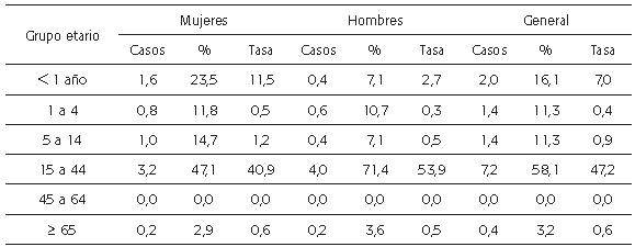 La mayor tasa de hospitalización durante el período a estudio, según el sexo, fue para las personas del sexo masculino; y según el grupo etario, en las personas entre 15 y 44 años, siendo más alta en las personas del sexo masculino; mientras que en el grupo de menores de un año, que ocupó el segundo lugar, la tasa más alta se presentó en las menores del sexo femenino; grupo de edad en el que junto con el de 65 y más años, según lo reportado en la literatura, se registran las mayores tasas de mortalidad 22. Es de aclarar que, en 2014, del total de casos notificados en el grupo etario de 65 y más años casi la mitad de ellos fueron hospitalizados. Así mismo, llama la atención que entre las personas del grupo de edad de 45 a 64 años ninguno fue hospitalizado.