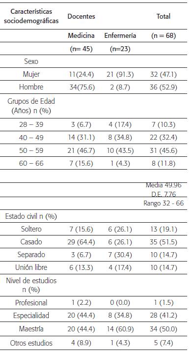 Hombres 52.9 %, mujeres 47.1 %. Docentes de enfermería predominio mujeres diez a uno. Docentes de medicina: una mujer por cada tres hombres. Edad promedio: 50 años, DE= 7.8, rango 32 a 66 años. Estado civil: predominó casada/o, 51.5 %. Nivel de estudios: la mitad con maestría (tabla 1).