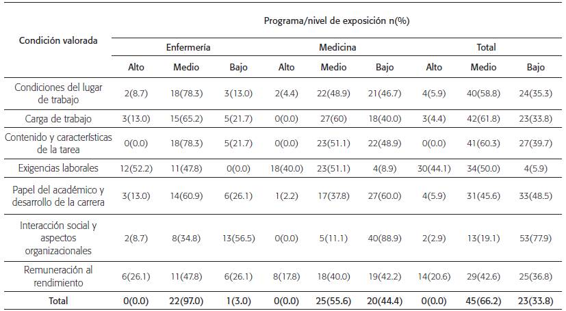 Respecto a la relación entre presencia de condiciones psicosociales de trabajo negativas, exposición a situaciones y comportamientos de violencia y acoso psicológico y autopercepción sobre el nivel de salud mental, se encontró que para ambos grupos la presencia de nivel medio de condiciones psicosociales negativas se asoció con una probabilidad alta de presencia de situaciones y comportamientos de violencia, con 66% y p<0.000. Mientras que por grupos enfermería presentó porcentaje tres veces más alto de condiciones psicosociales de trabajo negativas y exposición a presencia de violencia (p<0.007). También se identificó diferencia estadística significativa entre grupos para cinco de las siete condiciones psicosociales evaluadas (condiciones del lugar de trabajo [p<0.023], carga de trabajo [p<0.024], contenido y características de la tarea [p<0.030], papel del docente y desarrollo de carrera [p<0.015], interacción social y aspectos organizacionales [p<0.005]), lo que hace a enfermería más susceptible de sufrir cualquier modalidad de violencia y acoso psicológico, y una autopercepción de su estado de salud mental más bajo [p<0.039] que medicina.