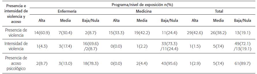 Asimismo, en enfermería la presencia de violencia alta es dos veces mayor que en medicina. Igualmente, intensidad de violencia con nivel de exposición cuatro veces mayor, y por cada docente de medicina, tres de enfermería habían experimentado situaciones y comportamientos de acoso psicológico.