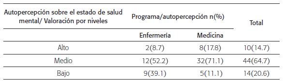 Para autopercepción del estado de salud mental predominó nivel medio (65 %). Grupo medicina manifestó sentirse en mejores condiciones de salud; 9 de 23 docentes enfermería refirieron nivel bajo, en oposición con 5 de los 45 médicos (tabla 5).