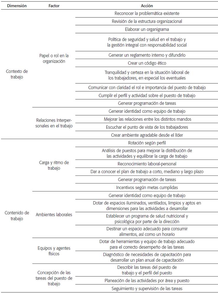 Materials and methods: Action research strategy integrating a group with the participation of the principal levels of the organizational structure, a process of five steps based on the results of a previous evaluation carried out through the "CTCPS-MAC", a battery used for the study of working conditions of psychosocial character perceived and the observation of workplace based on the Mexican normativity.