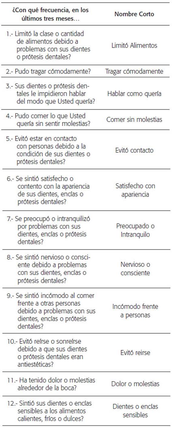A todos los pacientes se les aplicó el GO-HAI de forma consecutiva con un set de preguntas sociodemográficas. GOHAI es una escala de 12 reactivos expresados de forma interrogativa y que indaga sobre la autopercepción de CVRSB en los últimos tres meses con preguntas como: ¿cuántas veces ha tenido que utilizar algún medicamento para aliviar el dolor de sus dientes o las molestias de su boca? y ¿cuántas veces ha tenido molestias o dolor en sus dientes por el frío, calor o las cosas dulces? (tabla 1).