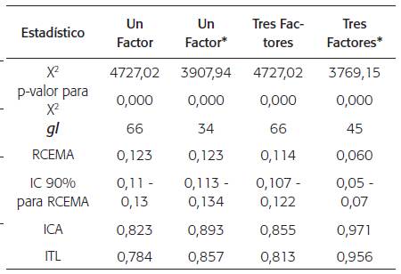 La evaluación del ajuste del modelo se realizó empleando los criterios propuestos por Hu & Bentler: p-valor para X2>0,05, RCEMA<0,06, ICA e ITL>0,95 27.