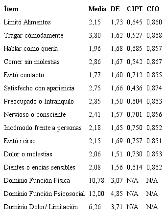 En consonancia con lo anterior, y a pesar de haber obtenido buen ajuste en el AFC, la validez de constructo es limitada, puesto que en el modelo con mejor ajuste (tres factores modificado) se debieron eliminar 2 ítems: ¿Limitó la clase o cantidad de alimentos debido a problemas con sus dientes o prótesis dentales? y ¿Sus dientes o prótesis dentales le impidieron hablar del modo en que usted quería?, lo cual afectó la capacidad de medición (captura de información) del instrumento 37. Además, el ítem ¿Se sintió satisfecho o contento con la apariencia de sus dientes, encías o prótesis dentales?, incluido en el dominio función, no representa adecuadamente el contenido de ese factor y podría sugerirse estar en el psicosocial.