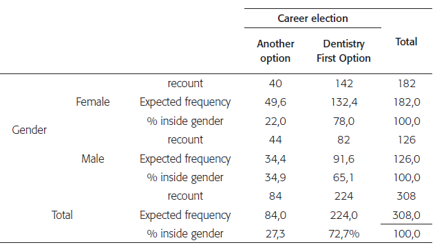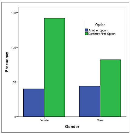 The results of this study indicate that the total sample, 72.7% of students selected Dentistry as first choice (Table 1), a highest percentage compared to a study made in Ireland 18 where the result was 65, 7%. Regarding gender differences, women in the total sample, chose the career as first choice by 78% and men 65.1% (figure 1).