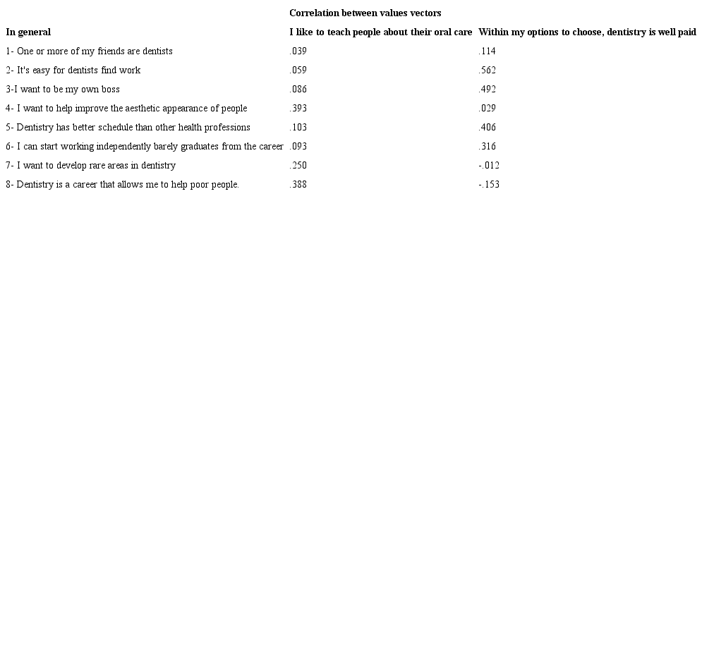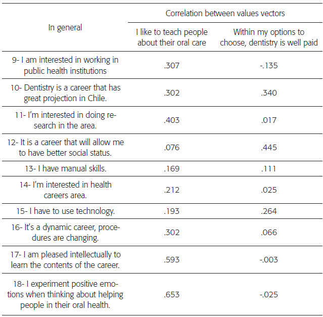 The observation of the distances (correlations between vectors) allowed to appreciate different and opposing levels of correlation analysis "In general" for all variables, except for: "One or more of my friends are dentists "," Dentistry is a career that has great projection in Chile "," I have manual skills "and" You have to use technology", in which there are no differences between student groups differentiated by the hierarchical choice order. In men, happened something similar to the analysis "in general", but the variables, in which there are no differences were: "One or more of my friends are dentists", "Dentistry has better schedule than other health professions" "I can start working independently just graduates from the career", "Dentistry is a career that has great projection in Chile", "it's a career that will allow me to have a better social status", "I have manual skills" and "I'm interested in health careers area". Finally, in women, also levels of different and opposing correlation analysis were observed, except for the variables: "One or more of my friends are dentists", "Dentistry is a career that has great projection in Chile" "I have manual skills" and "you have to use technology".
