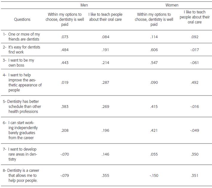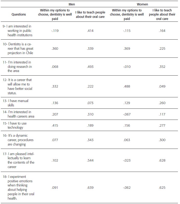 When analyzed by gender, the results show the same trend as the overall analysis (Table 3, 4, 5 and 6). Men and women belonging to the group "I like to teach people about their oral care", have a high correlation with questions related to intrinsic motivation, as well as men and women belonging to the group "within my options to choose dentistry is well paid" have high correlation with extrinsic motivation questions.