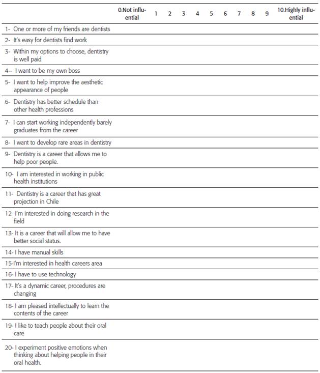 Then, minor adjustments were made and the instrument was applied to a group of students on a pilot basis (20 first-year dental students from USS). After this, no further changes were made. The final instrument was composed of 20 questions focused on the reasons why dental students choose this career.