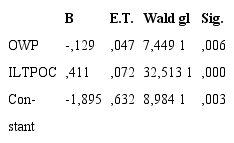 The ET are very low, demonstrating the accuracy of the estimation of the coefficients of the equation. The Wald statistic was highly significant for the coefficients of both variables, which indicated that these coefficients differ from the value 0 and therefore these results could be extrapolated to the population.