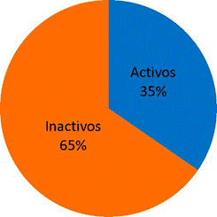 En cuanto a los niveles de actividad física, el 65,4 % de los niños, niñas y adolescentes participantes se categoriza como inactivo, es decir, que no cumple con las recomendaciones de actividad física, como es realizar al menos 60 minutos durante todos los días de la semana que incluyan ejercicios aeróbicos, de flexibilidad y de salud ósea como saltar (figura 1).