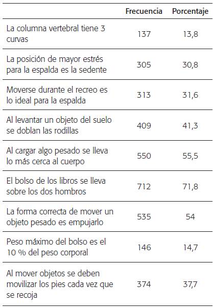 En la tabla 2 se observa el porcentaje de estudiantes que seleccionaron la respuesta correcta del cuestionario que indagó sobre el cuidado postural. Un menor porcentaje de escolares (14,7 %) reconoce que el peso máximo del bolso es el 10 % de su peso corporal; solo un 13,8 % reconoce que la columna vertebral tiene 3 curvas fisiológicas, lo que se infiere un bajo reconocimiento de su imagen corporal. Llama la atención que un porcentaje mayor, 71,8 %, conocen que el bolso o maletín de los libros se debe llevar sobre los dos hombros; igualmente sucede con la forma correcta de cargar un objeto pesado, un 56 % de los escolares respondió que cerca del cuerpo.
