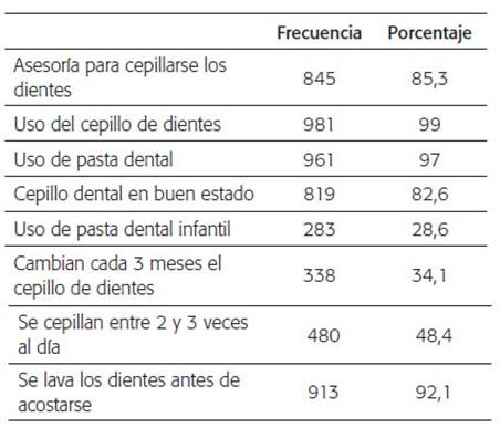 En cuanto a la salud bucal, en la tabla 3 se observa que en general los escolares reportan buenas prácticas en relación con este hábito saludable. La pasta infantil solo la usa un 28,6 % de los encuestados; y el 34,1 % cambia el cepillo de dientes cada 3 meses, como lo recomiendan los expertos. Asimismo, se observa que aunque un 48,4 % sí se cepilla entre 2 y 3 veces al día, un 52,6 % lo hace una vez al día.