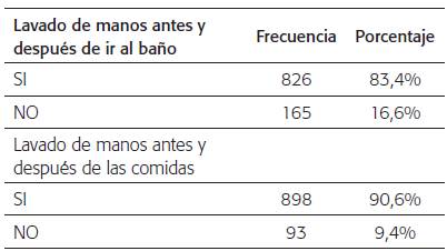 En la tabla 4 se observa que los estudiantes tienen en general una buena práctica de lavado de manos, aunque un 16,6 % y 9,4 % de los participantes expresaron que no se lavan las manos antes y después de ir al baño y manos antes y después de las comidas, respectivamente.
