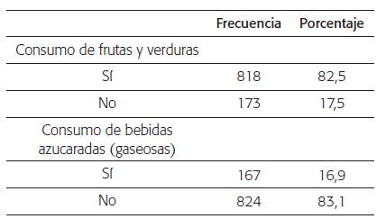 Aunque en su mayoría (82,5 %) los estudiantes tienen un buen consumo de verduras y frutas para mantener la salud, también llama la atención que un 17,5% no lo hace, y prefiere otros tipos de alimentos. También un 16,9 % manifestó el consumo de bebidas azucaradas tipo gaseosas en comparación con jugos naturales de frutas (tabla 5).