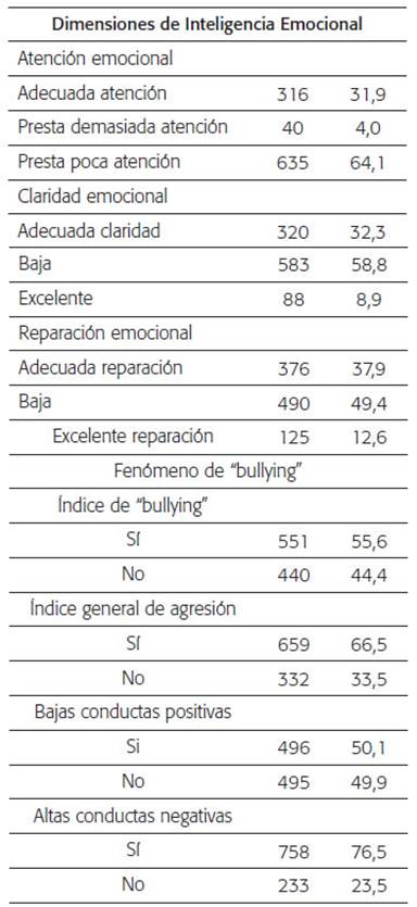En lo relacionado con la variable inteligencia emocional, resulta relevante que una importante proporción de niños y adolescentes presenta una baja capacidad de regulación de sus estados emocionales; esto se relaciona con el índice de "bullying" encontrado, el cual expresa el alto riesgo que tienen los niños para sufrir de algún tipo de agresión por parte de sus compañeros de escuela.