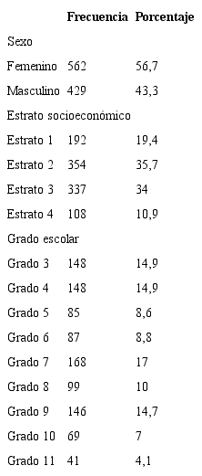 Se desarrolló un estudio descriptivo de corte transversal en una muestra de 991 niños, niñas y adolescentes con edades entre 7 y 17 años, provenientes de 16 escuelas públicas de Barranquilla (Colombia).