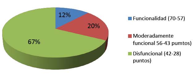 Al aplicar la Prueba de Percepción del Funcionamiento Familiar (FF-SIL) y las relaciones intrafamiliares: cohesión, roles, armonía, comunicación, afectividad, permeabilidad y adaptabilidad por medio de los instrumentos, se encontró que las principales categorías que afectaban la funcionalidad familiar fueron la cohesión y la armonía; además, el 67 % (46) de la familias eran disfuncionales, el 20 % 14 moderadamente funcionales, el 12 % 8 tenía una dinámica familiar funcional. Solo una fue clasificada como severamente disfuncional (ver figura 1).