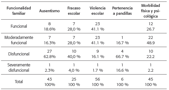 En cuanto a las conductas de riesgo adoptadas por los escolares y la funcionalidad familiar, se observó que el 66.7 % 4 de los escolares que pertenecían a pandillas, el 62.8 % (27) de los que presentaron ausentismo escolar y el 22.2 % 10 que presentó algún tipo de morbilidad, provenían de familias clasificadas como disfuncionales.