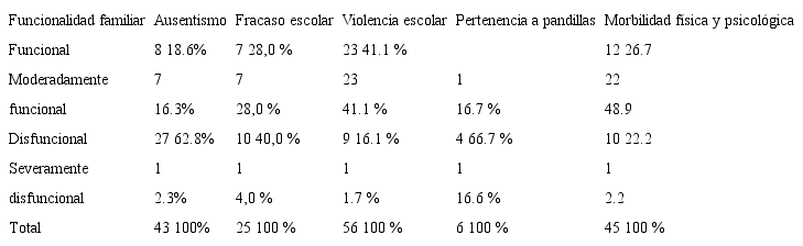 Discussion and conclusions: It can be affirmed that the students involved in the study from dysfunctional families showed more frequent gang membership, school absenteeism and some type of morbidity. In addition, they may present several risk behaviors simultaneously.
