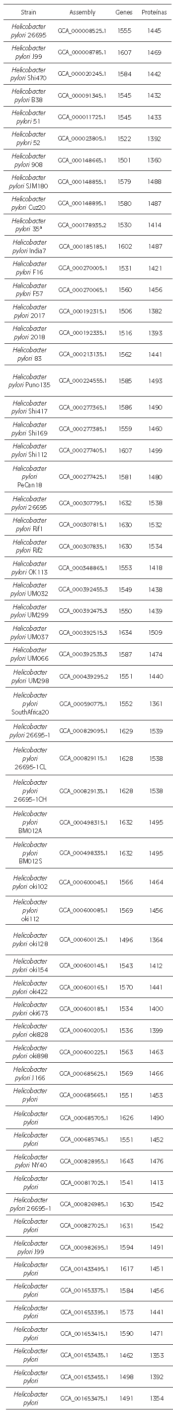 En total fueron halladas 683 anotaciones de genomas de Helicobacter pylori; de estos se seleccionaron 61 secuencias de cepas que contenían genoma completo, las cuales tenían en promedio 1571 genes y 1454 proteínas (tabla 1).