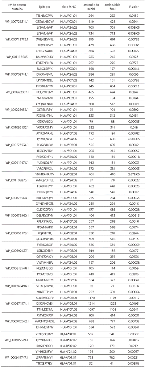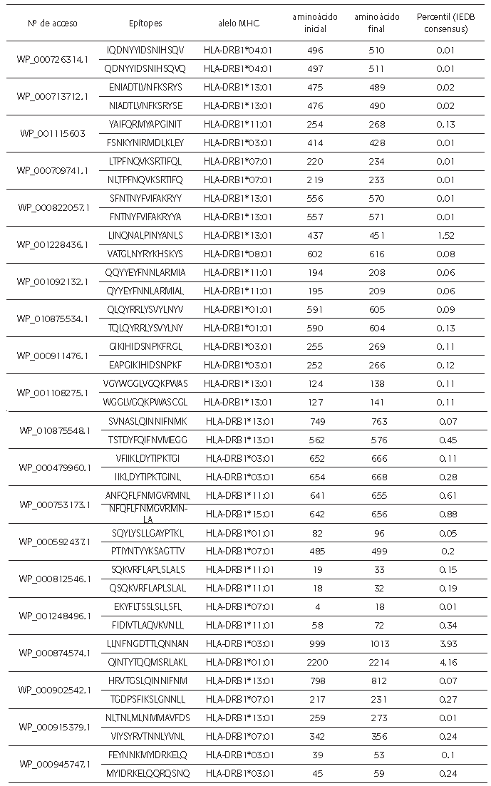 Se usa Vaxitop 40 para predecir epítopes de unión a MHC de clase I y II. Asimismo, se usaron diferentes programas para identificar epítopes, los cuales se encuentra listados en la tabla suplementaria 1.