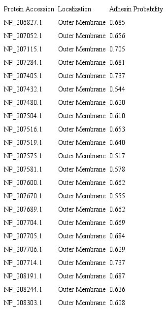 Se seleccionó de forma arbitraria la Cepa 26695 de Helicobacter pylori (número de acceso NC_000915), para la cual se han descrito 1445 proteínas en la que obtuvimos 42 proteínas de membrana externa de la bacteria, con una probabilidad adhesina >0.51, las cuales no tenían homología significativa a proteínas de cerdo, ratón o humano (tabla 2).