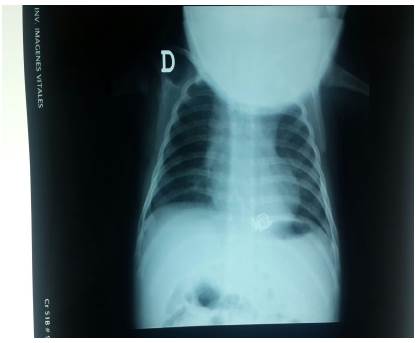 Neonato masculino a término de 18 horas de vida remitido a la UCIN del Camino Distrital Adelita De Char por cuadro clínico de dificultad respiratoria que se inició a las dos horas de nacido, manejado con oxigenoterapia sin mejoría clínica, por lo que deciden remitirlo a la UCIN de la institución. Producto del primer embarazo, de madre de 27 años, esta realizó todos los controles prenatales, serologías y grupo TORCH negativo, cursó con infección de vías urinarias tratadas ambulatoriamente. Nació por cesárea, por desprendimiento prematuro de placenta. Peso al nacer 3.100 gramos, talla 50 cms, apgar 1 min:7, 5 min:8, 10 min:9. Ingresa a la UCIN con FC:144 latidos por minuto, FR: 68 respiraciones por minuto, T: 36.5°C, sat: 98 %, con oxígeno por cámara cefálica con Fio2 40%, tirajes intercostales y subcostales, ruidos cardíacos rítmicos sin soplos, murmullo vesicular presente en ambos campos pulmonares; se realizó como impresión diagnóstica: Recién nacido a término 37 semanas por Ballard, Síndrome de dificultad respiratoria secundario a taquipnea transitoria del recién nacido; se ordenó continuar con oxígeno suplementario con Fio2 40 %, suspender vía oral, líquidos endovenosos de mantenimiento y antibioticoterapia de primera línea; se realizaron laboratorios (ver tablas 1 y 2) y radiografía de tórax, la cual fue normal (ver figura 1).