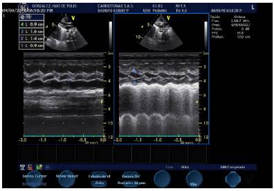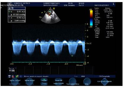 Se transfundió glóbulos rojos, se realizó rotación antibiótica a segunda línea, control de Radiografía de tórax sin cambios; se ordenó nuevamente ecocardiograma reportado por cardiología pediátrica: dilatación de cavidades cardiacas derechas con función sistólica izquierda conservada, comunicación interauricular (CIA) pequeña y presión pulmonar estimada de 71 mmHg. (ver figura 3).