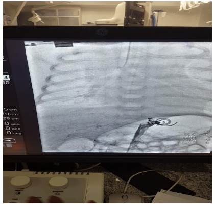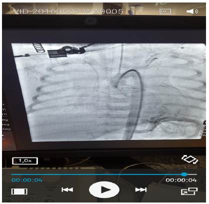 Se practicó cateterismo cardiaco, que reportó: secuestro pulmonar de lóbulo inferior derecho, que drena a través de un colector hacia vena ácigos, hipertensión pulmonar severa, cortocircuito de izquierda a derecha severo, CIA, test de vasoreactividad pulmonar positivo al iloprost; se realizó embolización de secuestro pulmonar con nit oclud coils 9/6, con inmediato resultado efectivo. (Ver figuras 4 y 5).